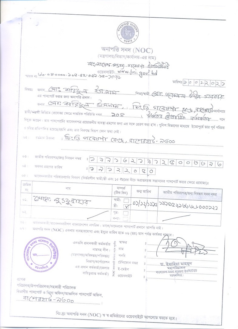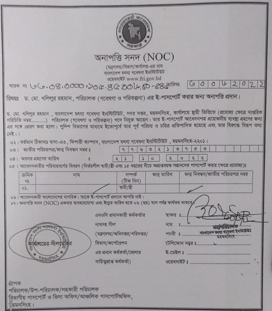 ড. মো. খলিলুর রহমান, পরিচালক (গবেষণা ও পরিকল্পনা), সদর দপ্তর, বাংলাদেশ মৎস্য গবেষণা ইনস্টিটিউট এর অনাপত্তি পত্র | |
