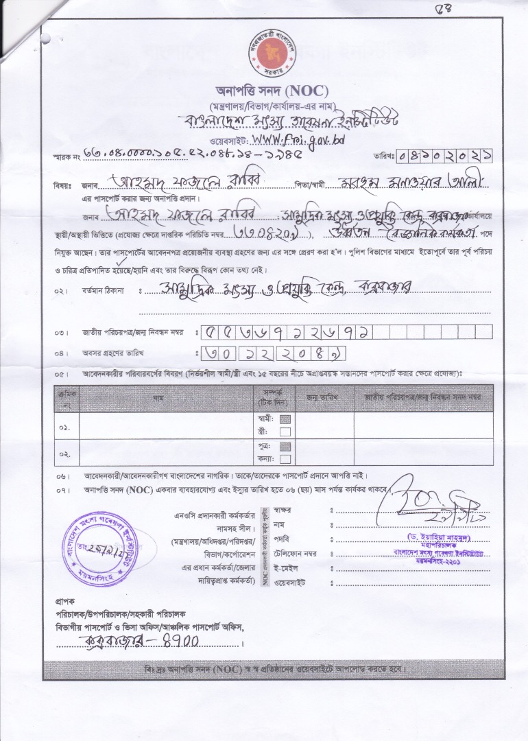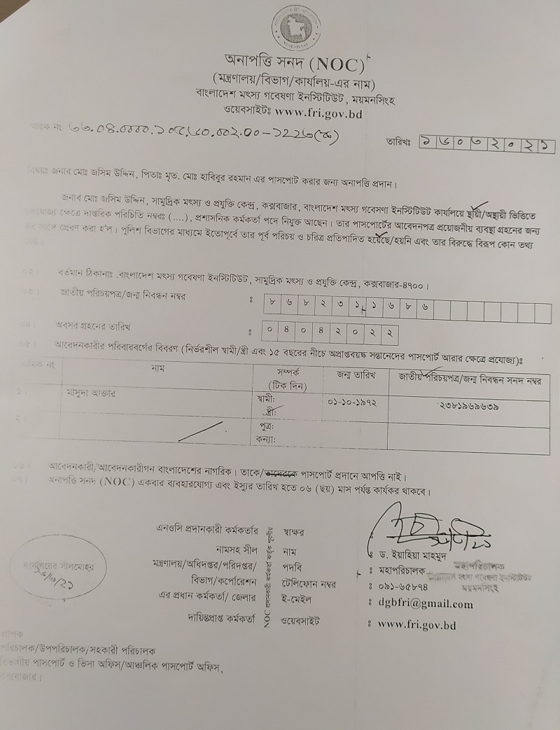 | জনাব তুরাবুর রহমান, পিতাঃ মোঃ নাজিম উদ্দিন, বৈজ্ঞানিক কর্মকর্তা, বাংলাদেশ মৎস্য গবেষণা ইনস্টিটিউট, সামুদ্রিক মৎস্য ও প্রযুক্তি কেন্দ্র, কক্সবাজার এর পাসপোর্ট করার জন্য অনাপত্তি পত্র |