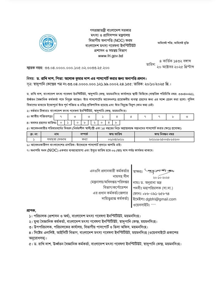 | ড. রাখি দাশ, ঊর্ধ্বতন বৈজ্ঞানিক কর্মকর্তা, স্বাদুপানি কেন্দ্র, বাংলাদেশ মৎস্য গবেষণা ইনস্টিটিউট এর অনাপত্তি পত্র |  |