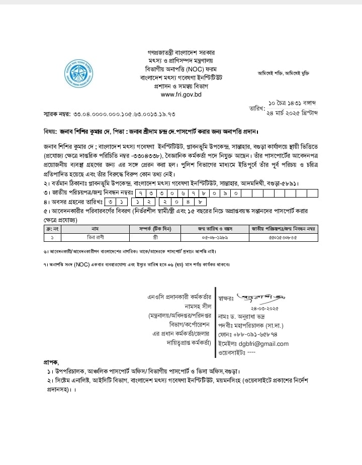 ড. মোঃ আনিছুর রহমান, পরিচালক (প্রশাসন ও অর্থ), সদর দপ্তর, বাংলাদেশ মৎস্য গবেষণা ইনস্টিটিউট এর অনাপত্তি পত্র | |