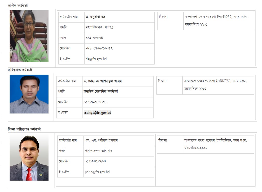 | দায়িত্বপ্রাপ্ত কর্মকর্তা | বিকল্প দায়িত্বপ্রাপ্ত কর্মকর্তা | আপিল কর্মকর্তা | |