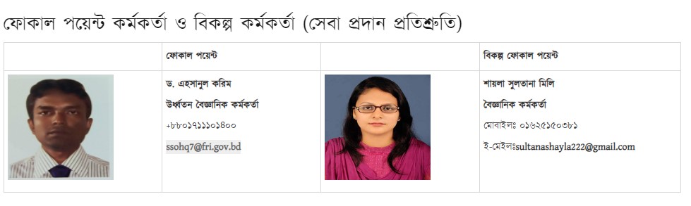 | ইমেইলঃ | diradmin@fri.gov.bd | systemanalyst@fri.gov.bd | ssofs7@fri.gov.bd | sohq4@fri.gov.bd | pubofficer@fri.gov.bd | sohq2@fri.gov.bd |