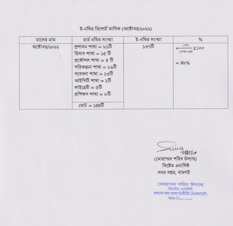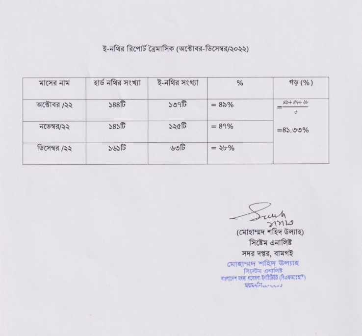| ই-নথির ব্যবহার রৃদ্ধি | শাখাভিত্তিক উপস্থাপিত ই-নথি জুলাই আগষ্ট, সেপ্টেম্বর, অক্টোবর, নভেম্বর, ডিসেম্বর, জানুয়ারী, ফেব্রুয়ারী, মার্চ, এপ্রিল, মে ও জুন শাখাভিত্তিক উপস্থাপিত ই-নথি ১ম ত্রৈমাসিক প্রতিবেদন, ২য় ত্রৈমাসিক প্রতিবেদন, ৩য় ত্রৈমাসিক প্রতিবেদন ও ৪র্থ ত্রৈমাসিক প্রতিবেদন এবং হার্ড নথির স্টেটমেন্ট জুলাই আগষ্ট, সেপ্টেম্বর, অক্টোবর, নভেম্বর, ডিসেম্বর, জানুয়ারী, ফেব্রুয়ারী, মার্চ, এপ্রিল, মে ও জুন হার্ড নথির স্টেটমেন্ট ১ম ত্রৈমাসিক প্রতিবেদন, ২য় ত্রৈমাসিক প্রতিবেদন, ৩য় ত্রৈমাসিক প্রতিবেদন ও ৪র্থ ত্রৈমাসিক প্রতিবেদন