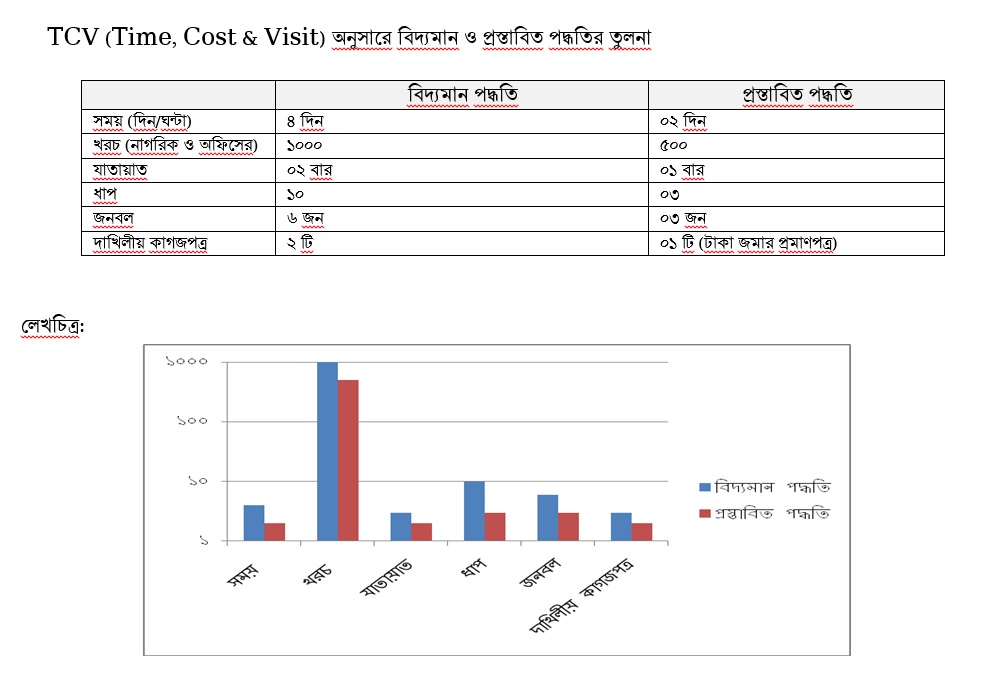 | সেবা সহজিকরণ/ডিজিটাইজেশনের মাধ্যমে উদ্ভাবনী বাস্তবায়ন | বিদ্যমান প্রসেস ম্যাপ , প্রস্তাবিত প্রসেস ম্যাপ, টিসিভি বিশ্লেষণ, অফিস আদেশ ও পোনার তথ্য |
