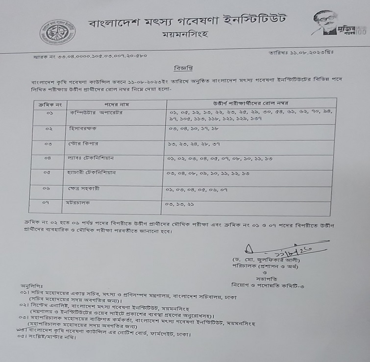 বাংলাদেশ মৎস্য গবেষণা ইনস্টিটিউট এর বৈজ্ঞানিক কর্মকর্তা পদে ২৮-১১-২০২০ তারিখে অনুষ্ঠিত লিখিত পরীক্ষায় অংশ গ্রহণকারীদের মধ্যে উত্তীর্ণদের তালিকা | তালিকা |