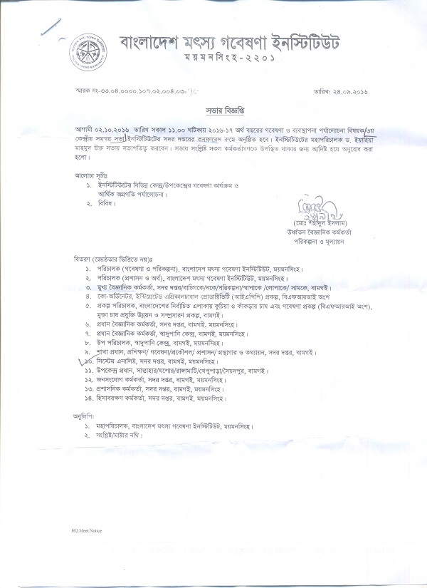 | মোহাম্মদ শহিদ উল্যাহ, সিষ্টেম এনালিষ্ট, সদর দপ্তর, বাংলাদেশ মৎস্য গবেষণা ইনস্টিটিউট এর বহিঃ বাংলাদেশ ছুটির অফিস আদেশ | ![]() |