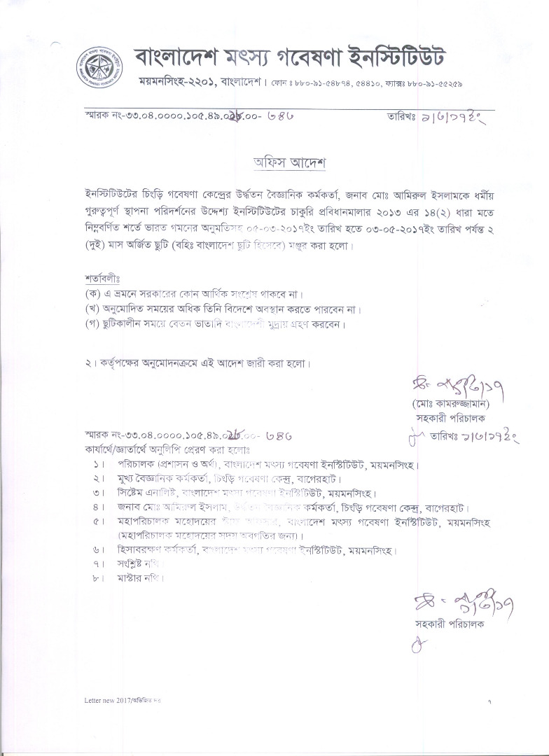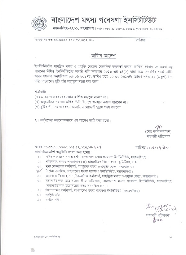 | ড. ইনামুল হক, প্রধান বৈজ্ঞানিক কর্মকর্তা, বিএফআরআই এর বহিঃ বাংলাদেশ ছুটির অফিস আদেশ | ![]() |