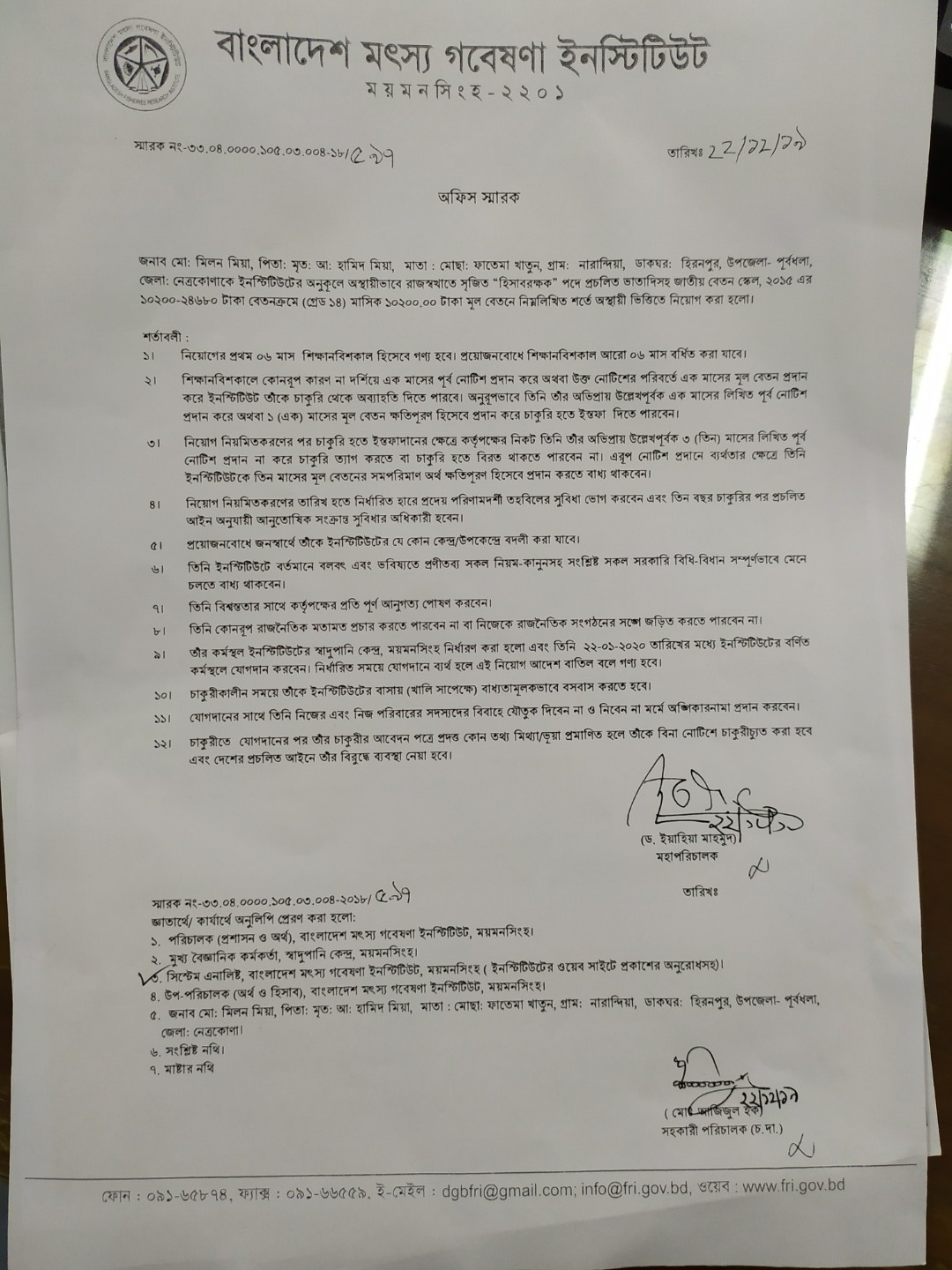 | জনাব মোঃ মিলন মিয়া, হিসাবরক্ষক পদে নিয়োগের অফিস স্মারক | ![]() |