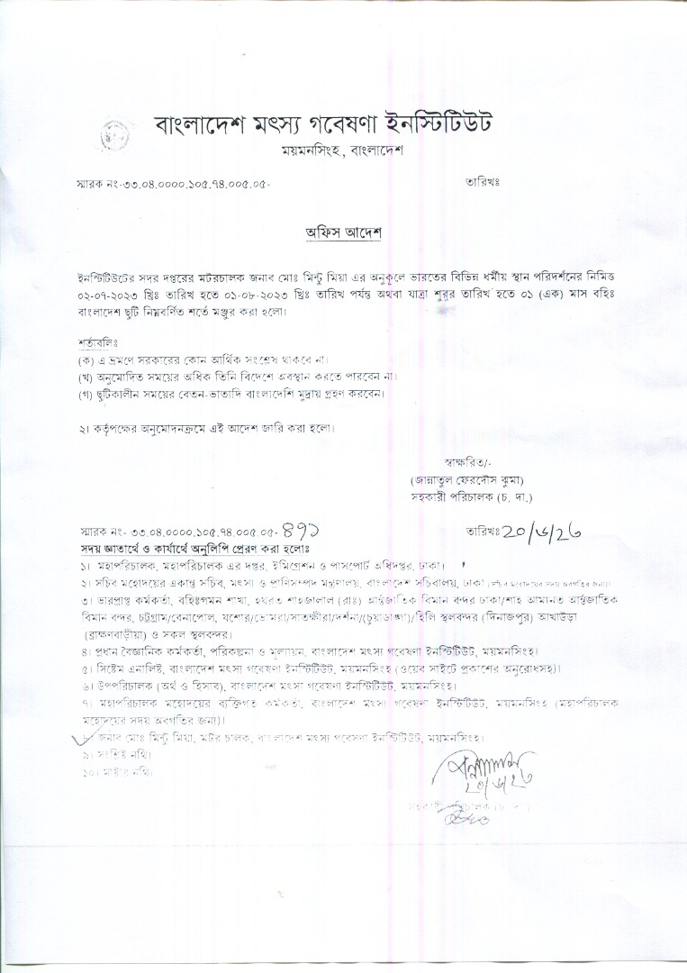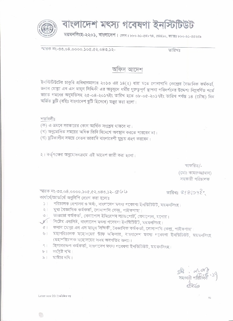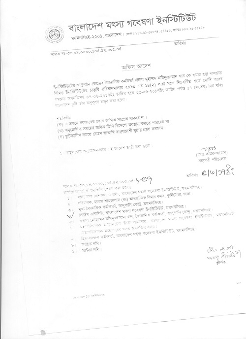 | নুর-এ-রওশন, বৈজ্ঞানিক কর্মকর্তা, বিএফআরআই এর বহিঃ বাংলাদেশ ছুটির অফিস আদেশ | ![]() |