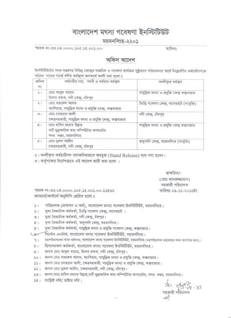 | জনাব মোঃ আজাহার আলী, উর্ধ্বতন বৈজ্ঞানিক কর্মকর্তা ও জনাব বি এম শাহিনুর রহমান, বৈজ্ঞানিক কর্মকর্তা এর বদলী আদেশ | ![]() |