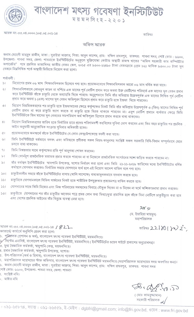 | জনাব মেহেদী মাহমুদ রাজীব, অফিস সহকারী কাম কম্পিউটার অপারেটর পদে নিয়োগের অফিস স্মারক | ![]() |